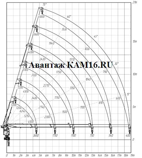 грузоподъемность на максимальном вылете стрелы 18.8 метрах — 400 кг.
